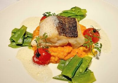 Gebratener Winterkabeljau mit glasierten Zuckerschoten und Tomaten-Risotto