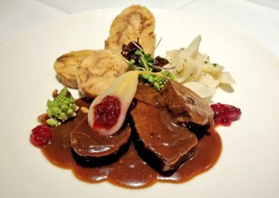 Geschmorte Sauerländer Rothirschkeule in Preiselbeerjus mit Schwarzwurzelgemüse und gebratenen Serviettenknödel