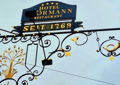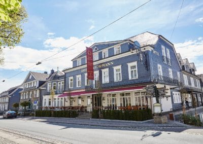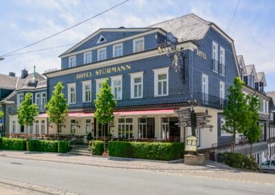 Wir sind seit Jahr und Tag bekennende „Sauerland-Wiederholungstäter“. Denn regelmäßig zieht es uns zu genussvollen Momenten in das mit fünf Sternen klassifizierte „Romantik & Wellnesshotel Deimann“ im Schmallenberger Ortsteil Winkhausen mit seinen splendiden Offerten in seinen stilvoll-eleganten Wohnwelten, verbunden mit feinster Kulinarik (1 Michelin-Stern) und erstklassiger SPA-Landschaft. Doch dieses Ma(h)l führt uns unsere Reiseroute im Zeichen erlesener Gastlichkeit in die von Fachwerkhäusern und schmucken Geschäften gesäumte Altstadt von Schmallenberg. Wir logieren und genießen im ebenfalls zur Hoteliersfamilie Deimann gehörenden Schwesterhotel „Störmann“, ein gastliches Traditionshaus mit langer Historie und ganz viel heimeligem Charme. Seit dem Jahr 2016 gehört das Vier-Sterne-Hotel mit seinen 40 Zimmern und den urgemütlichen Gaststuben zum Portfolio von Familie Deimann. Die Ursprünge der gastlichen Einkehr reichen weit zurück: Es war das Jahr 1769, als der Posthalter Johann Anton Störmann die Genehmigung erhielt auf seinem Anwesen Schnaps auszuschenken, die gastliche Stätte wird zur „Königlich Preußischen Posthalterei“ erhoben und Familie Störmann macht ihre Einkehr in den Folgegenerationen zur „Guten Stube“ von Schmallenberg. Konrad Adenauer ist hier zu Gast und viele andere prominenten Zeitgenossen mehr. Gesundheitliche Gründe zwingen Anton und Silvia Störmann im Jahr 2016 ihr Familienhotel ab- und in die Hände der befreundeten Familie Deimann zu übergeben. Ein wahrer Glücksgriff für die Schmallenberger und die stattliche Zahl der Stammgäste, denn mit der Fortführung und der sukzessiven Renovierung von Zimmern und Gasträumen war die „Institution Störmann“ für die Zukunft gesichert. Es ist das Verdienst von Theo Deimann und seinen Kindern Jochen, Andreas und Eva, dass der einzigartige Charme und die einladende Gemütlichkeit der Stuben originär erhalten blieb. Nach wie vor geht man ins „Störmann“, in das „Wohnzimmer“ Schmallenbergs, treffen sich hier die Stammtische, werden Vertragsabschlüsse, Hochzeiten und Geburtstage gefeiert: und am urgemütlichen Tresen der Poststube heimisches Bier genossen. Seit alters her ist die Kulinarik in der Post‑, Bauern- und Brunnenstube des Hotels von ausgewiesener Güte und sie wird weithin gerühmt wegen ihrer regionalen Verwurzelung und exzellenten Produktqualität. Der elegant gestaltete Valentinssaal eignet sich bestens für Veranstaltungen vielfacher Couleurs. Es gibt auch einen kleinen Wellnessbereich mit Sauna und Hallenschwimmbad.