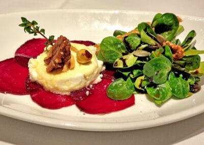 Ziegenfrischkäsetaler mit Waldhonig und Nüssen gratiniert, auf Rote Bete und Feldsalat