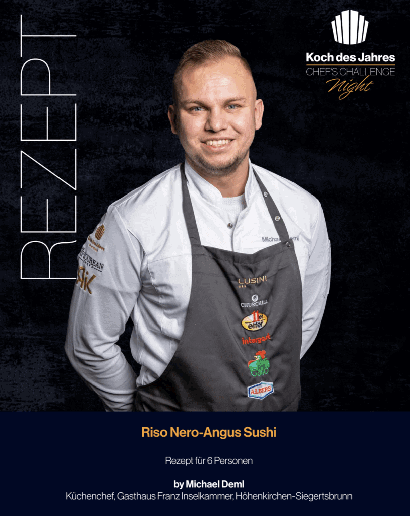 Michael Deml, Küchenchef im Gasthaus Franz Insel­kammer in Höhen­kirchen-Siegerts­brunn, präsen­tierte bei der Chef’s Challenge Night im Halbfinale von Koch des Jahres 2025 eine überra­schende Kombi­nation, die das klassische Sushi neu inter­pre­tiert: sein Riso Nero-Angus Sushi.