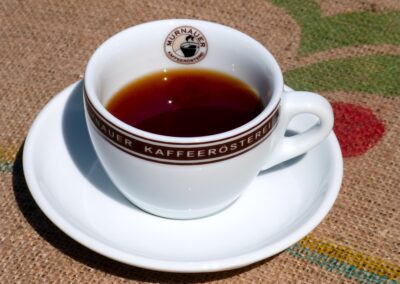 Guter Kaffee-Geschmack ist das Ergebnis eines langen Prozesses: Vom gesunden Setzling, nachhal­tigem Anbau und Ernte über den Export zur schonenden Röstung bis zur finalen Zubereitung. Vor der Röstung liegt es in der Hand der Röstmeister, welche Kaffee­bohnen in den Tassen landen. Am wichtigsten sind eine gleich­mäßige Form und Größe, denn das bedeutet, dass sie bei der Pflückung den gleichen Reifegrad hatten und somit auch gleich­mäßig geröstet werden können. Dann folgen erste Prober­ös­tungen und umfang­reiche Verkos­tungen der Testmuster. Erst wenn die Röstmeister der Murnauer Kaffee­rös­terei wirklich hervor­ste­chende Rohbohnen vor sich haben, wird der Kauf getätigt.